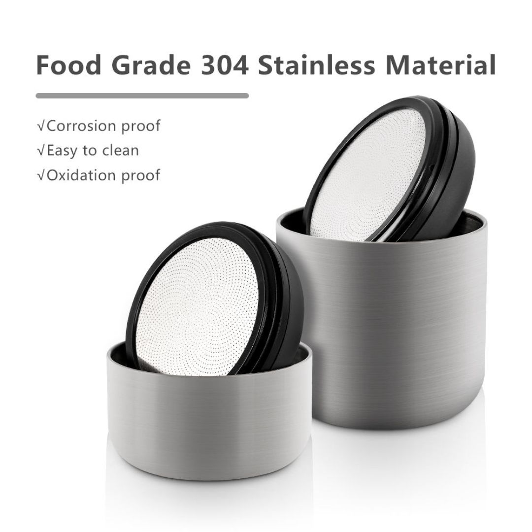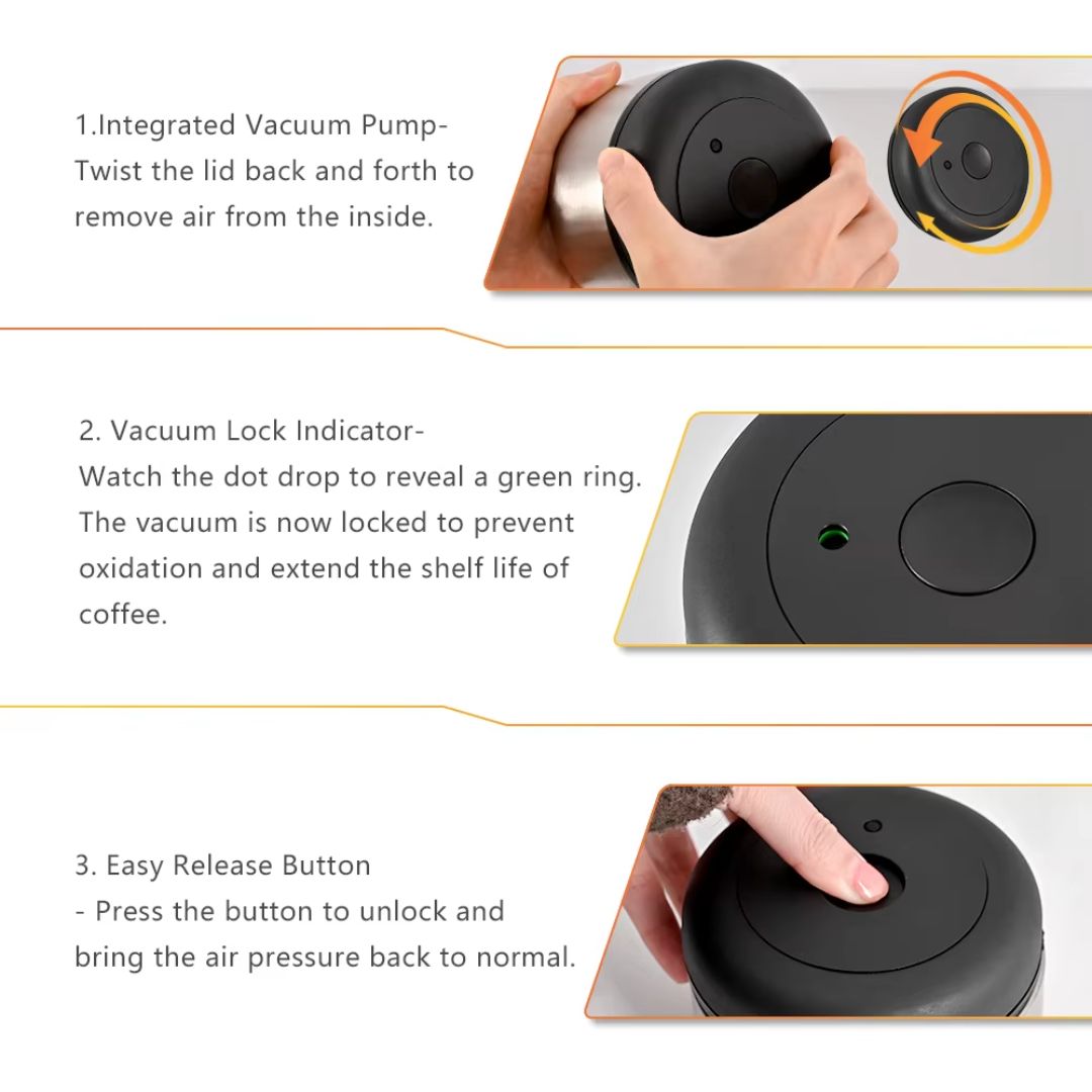 Crafted from premium food-grade stainless steel, this canister features an innovative manual airlock system that removes excess oxygen, extending the shelf life of your coffee beans or grounds.